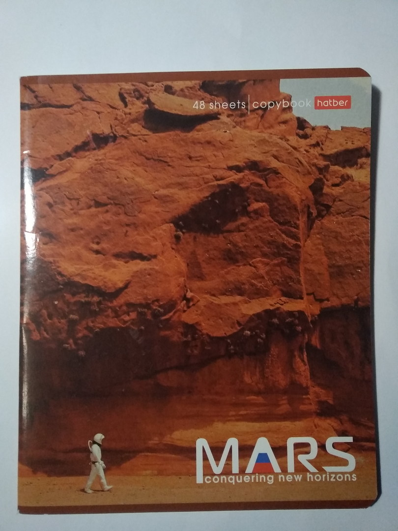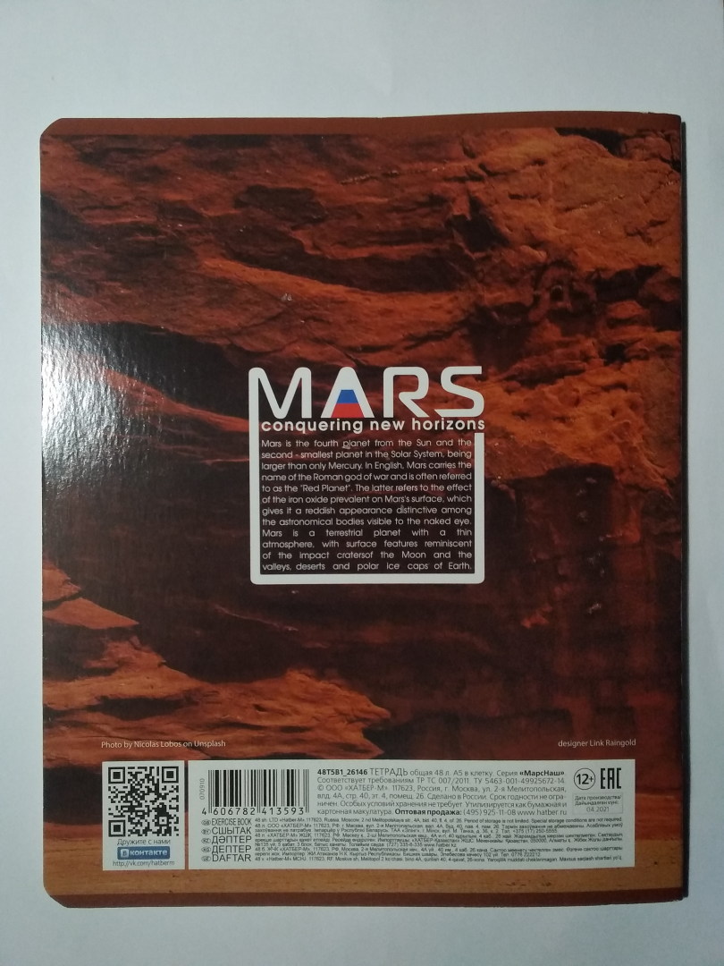 И что же мы тут видим? Несмотря на наличие российского триколора и говорящего названия серии "МарсНаш" описание планеты всё равно на английском. Ну да, тетрадка выпущена аж в 2021 году, но после ряда событий прямо-таки символизирует... :-(
